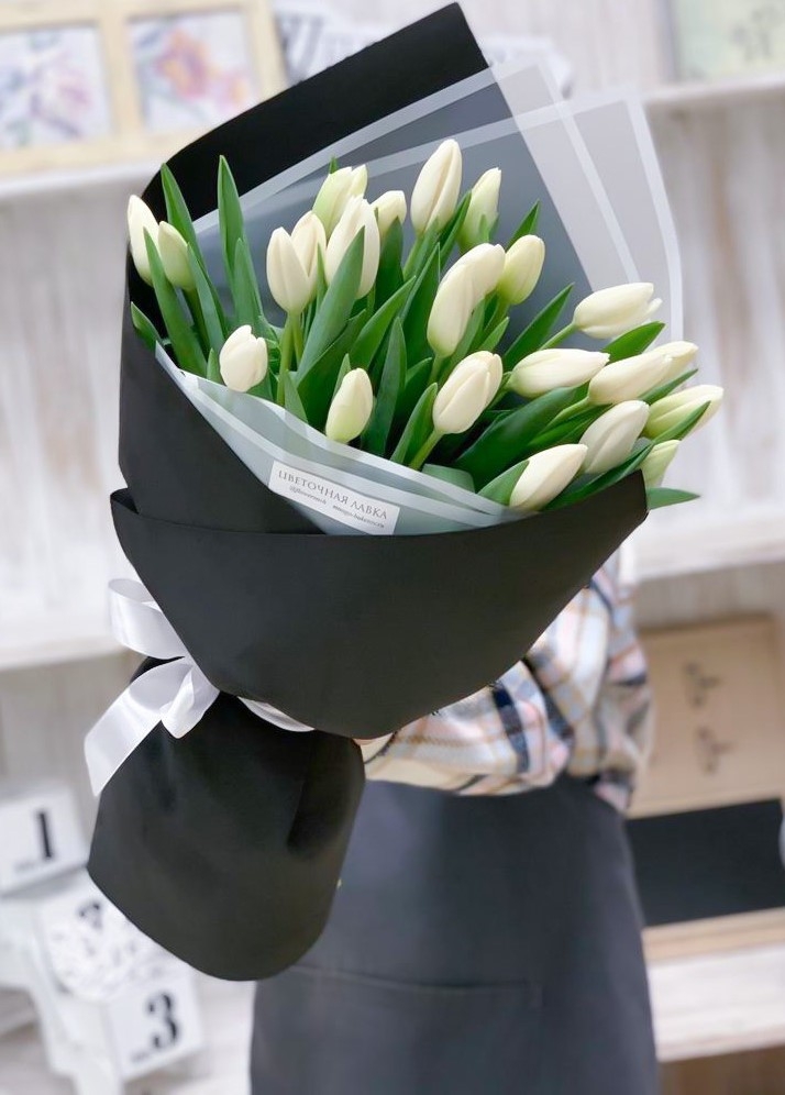 25 белых Тюльпанов в дизайнерской упаковке
