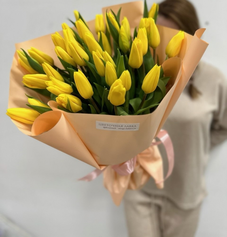 35 желтых тюльпанов в фирменной упаковке
