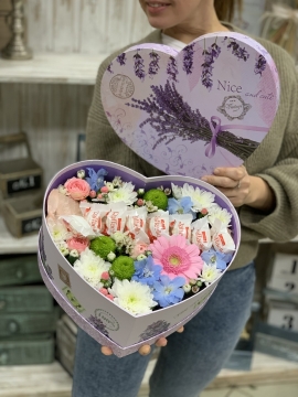 Большая Коробка счастья, сладостей и цветов. Состав цветов может отличаться от фото