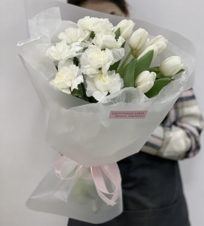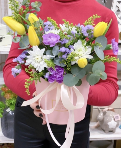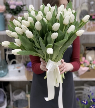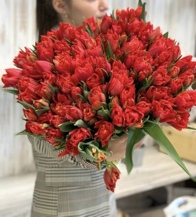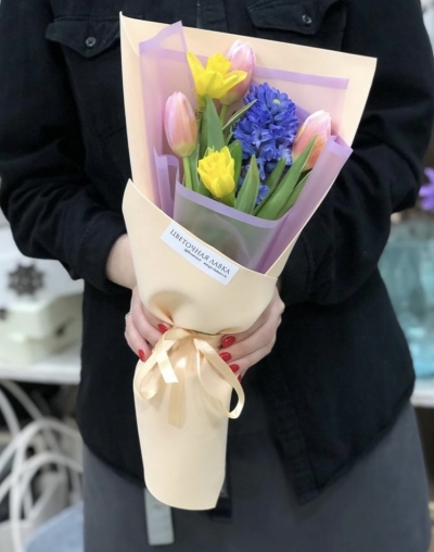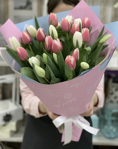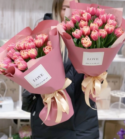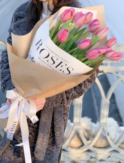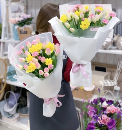15 жёлтых тюльпанов в дизайнерской упаковке